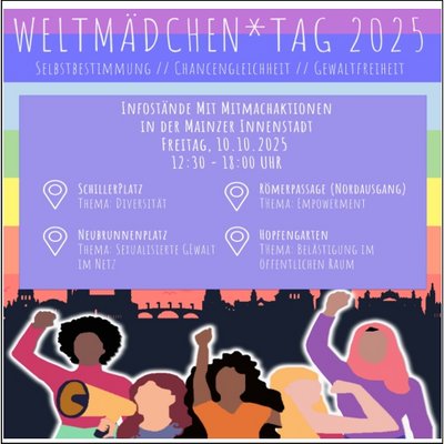 Der Mädchenarbeitskreis Mainz wird von 12:30 Uhr - 18:00 Uhr Infostände (+ kleine Mitmachaktionen) an verschiedenen Standorten in der Innenstadt vorbereiten (am Schillerplatz, - am Neubrunnenplatz, - in der Adolf-Kolping-Straße/ Nordausgang Römerpassage und auf dem Hopfengarten; genaue Infos auf dem Plakat).