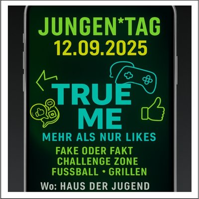 am Freitag, den 12.09.25. von 15:00 - 19:00 Uhr mit dem Thema: True me - Mehr als nur Likes (dahinterliegendes Thema: Social media & Männlichkeit).