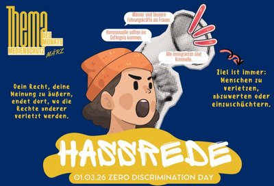 Im März rückt das Infoplakat das Thema Hassrede in den Mittelpunkt – ein Problem, das viele junge Menschen täglich in sozialen Netzwerken, Chats oder Online-Games erleben. Unter Hassrede werden abwertende Kommentare, Beleidigungen oder Drohungen verstanden, die sich gezielt gegen bestimmte Gruppen richten und Menschen verletzen sollen.