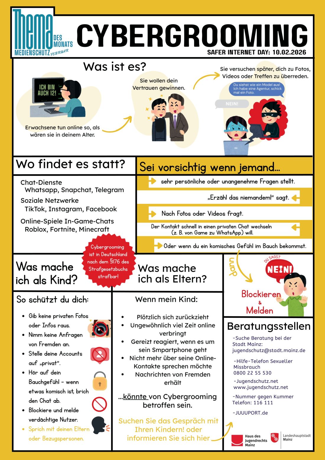 Der Februar steht außerdem im Zeichen des Safer Internet Days, der weltweit am 10.02.26 auf mehr Sicherheit im Netz aufmerksam macht. Vor diesem Hintergrund erklärt das Plakat altersgerecht, wie Cybergrooming funktioniert, welche Warnsignale es gibt und mit welchen einfachen Schritten Kinder und Jugendliche sich schützen können.
