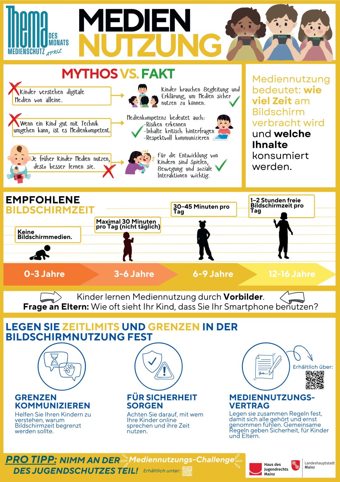 Darüber hinaus gibt das Infoplakat eine Orientierung zur Bildschirmzeit je nach Alter und zeigt, wie wichtig feste Regeln im Familienalltag sind. Ein gemeinsam erarbeiteter Mediennutzungsvertrag kann dabei helfen, klare Absprachen zu treffen und Verständnis für alle Beteiligten zu schaffen.