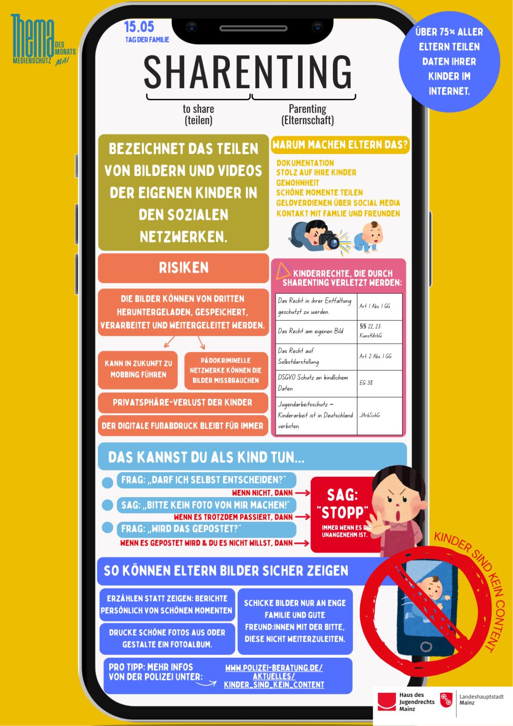 Das Infoplakat im Mai macht deutlich, dass Sharenting nicht nur eine Frage des Teilens ist, sondern auch der Verantwortung. Einmal veröffentlichte Inhalte können dauerhaft im Netz bleiben, weiterverbreitet oder missbräuchlich genutzt werden. Gleichzeitig betrifft dies grundlegende Rechte von Kindern, wie den Schutz ihrer Privatsphäre und ihr Recht auf Selbstbestimmung.