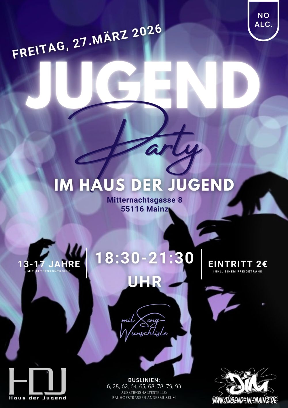 Hintergrundinfo zur Party: Initiiert durch Projektgruppen aus der Jugendkonferenz 2023 und durch den großen Anklang der bisherigen Jugendparties, gibt es nun eine Neuauflage im Haus der Jugend. Bitte Songwünsche mitbringen!