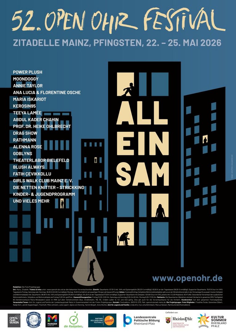 Vom 22. bis 25. Mai 2026 ist die Mainzer Zitadelle wieder Treffpunkt für annähernd zehntausend interessierte Festivalbesucher:innen. Unter dem Titel "ALLEINSAM" beschäftigt sich das OPEN OHR Festival u.a. mit dem Tabuthema Einsamkeit und den sozialen, politischen und gesundheitlichen Ursachen und Folgen von Einsamkeit. Das Thesenpapier als PDF-Download.
