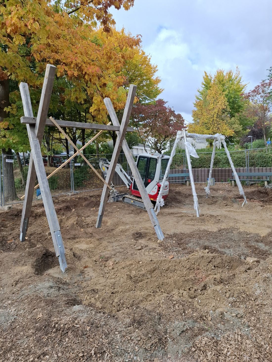 Aktuell (09.10.25): Heute wurden übergangsweise zwei Doppelschaukeln installiert. Da die Betonfundamente jedoch noch ca. 4 Wochen aushärten müssen, können die Schaukeln noch nicht sofort benutzt werden. Leider ist noch etwas Geduld erforderlich. Die Freigabe soll in der 45. Kalenderwoche (v. 03.- 07.11.25) erfolgen. Hier ein Bild von der Baustelle mit den beiden Schaukeln!